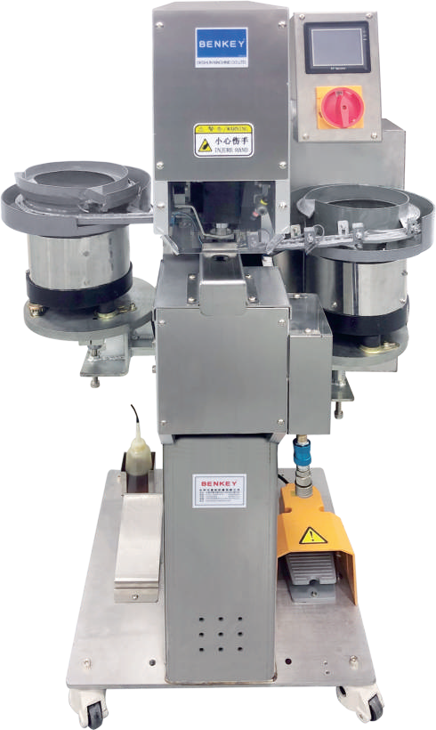 把鈕扣放進對應的2個料斗,開機會自動轉動料斗,自動把鈕扣排滿執道,自動把鈕扣送到上下模具,櫚服電機驅動,只要踩下踏腳開關便可沖孔裝訂,簡單易用上下模具對向運動穿透力好。更換配件可以裝訂其它鈕扣